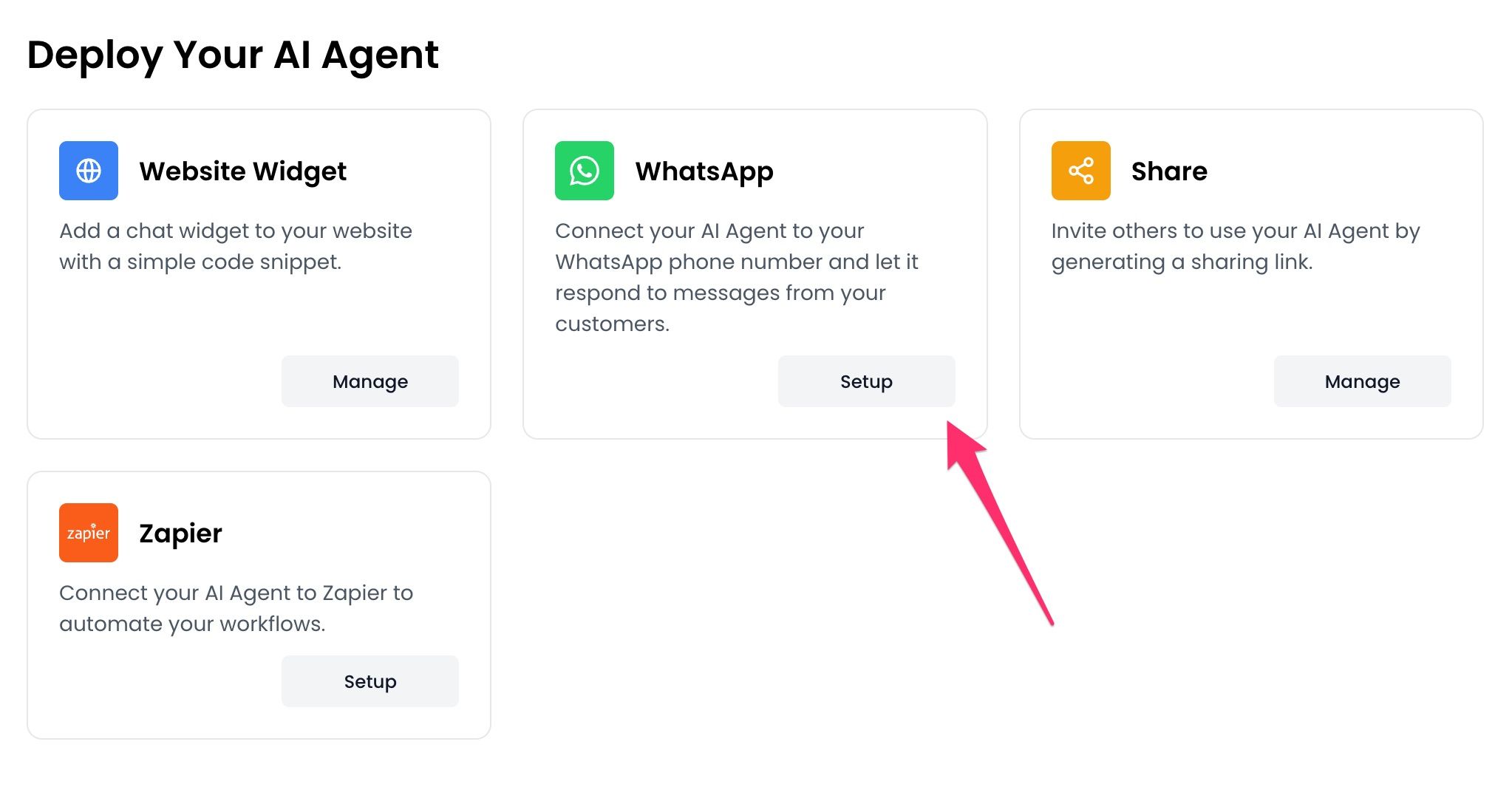 Go to your agentβs dashboard β click Deploy in the sidebar β then click Setup under the WhatsApp integration option.